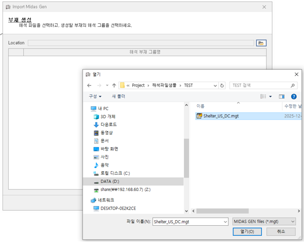 1. 먼저 'Import Midas' 기능 실행하고, Midas(MGT)파일을 선택합니다.