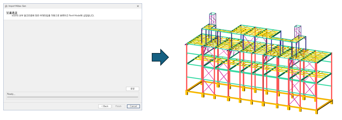 이처럼 몇 단계의 작업만으로 Midas 구조해석파일을 기반으로 Revit 구조 모델을 빠르고 정확하게 생성할 수 있습니다.