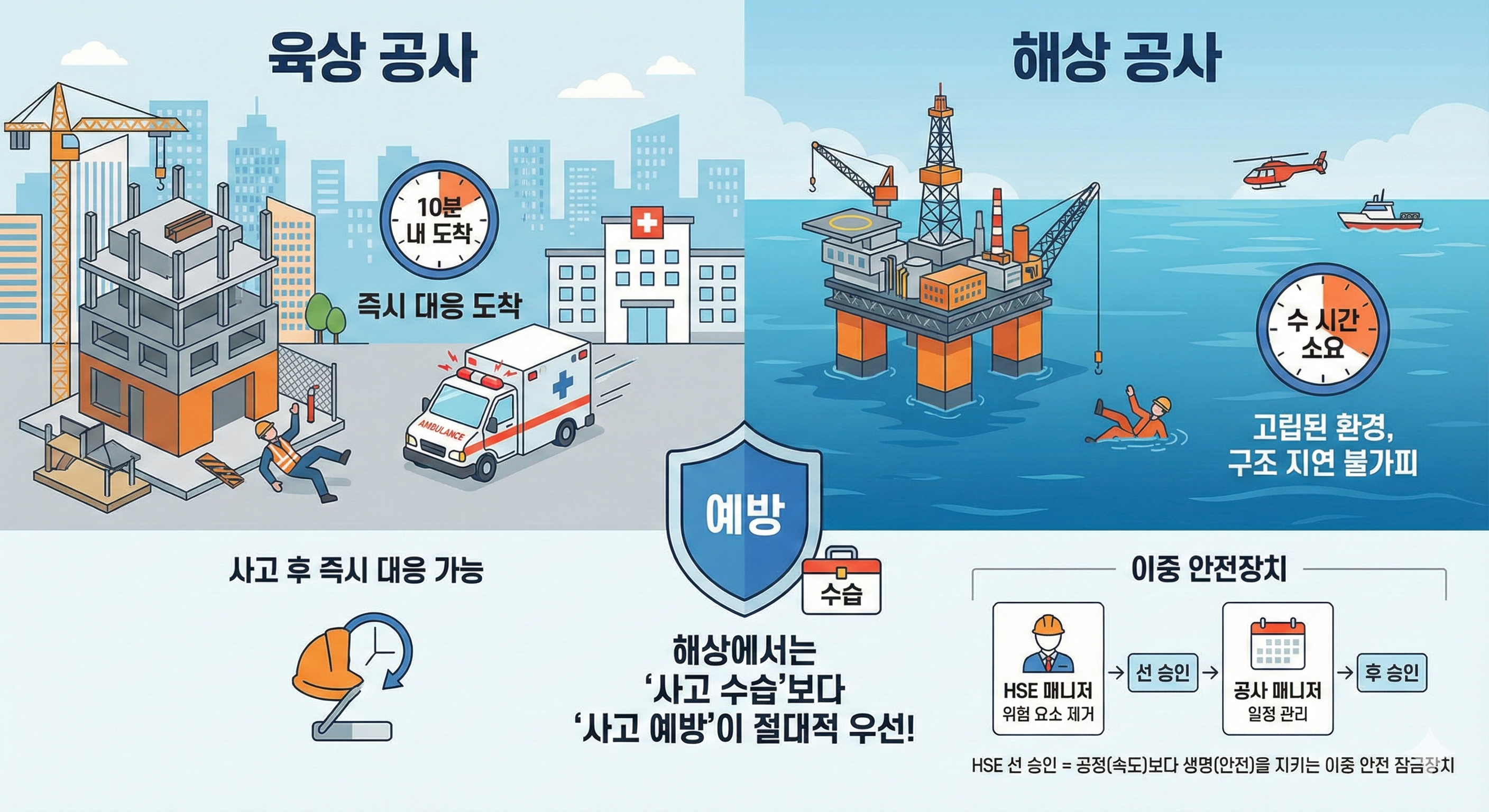 1. 고립된 해상환경에서 안전확보 : 육상 공사는 사고가 나면 즉시 119가 올 수 있지만, 해상은 육지에서 멀리 떨어져 있어 구조대가 도착하는 데 수 시간이 걸릴 수 있습니다. 즉, '사고 수습'보다 '사고 예방'이 절대적으로 중요합니다.