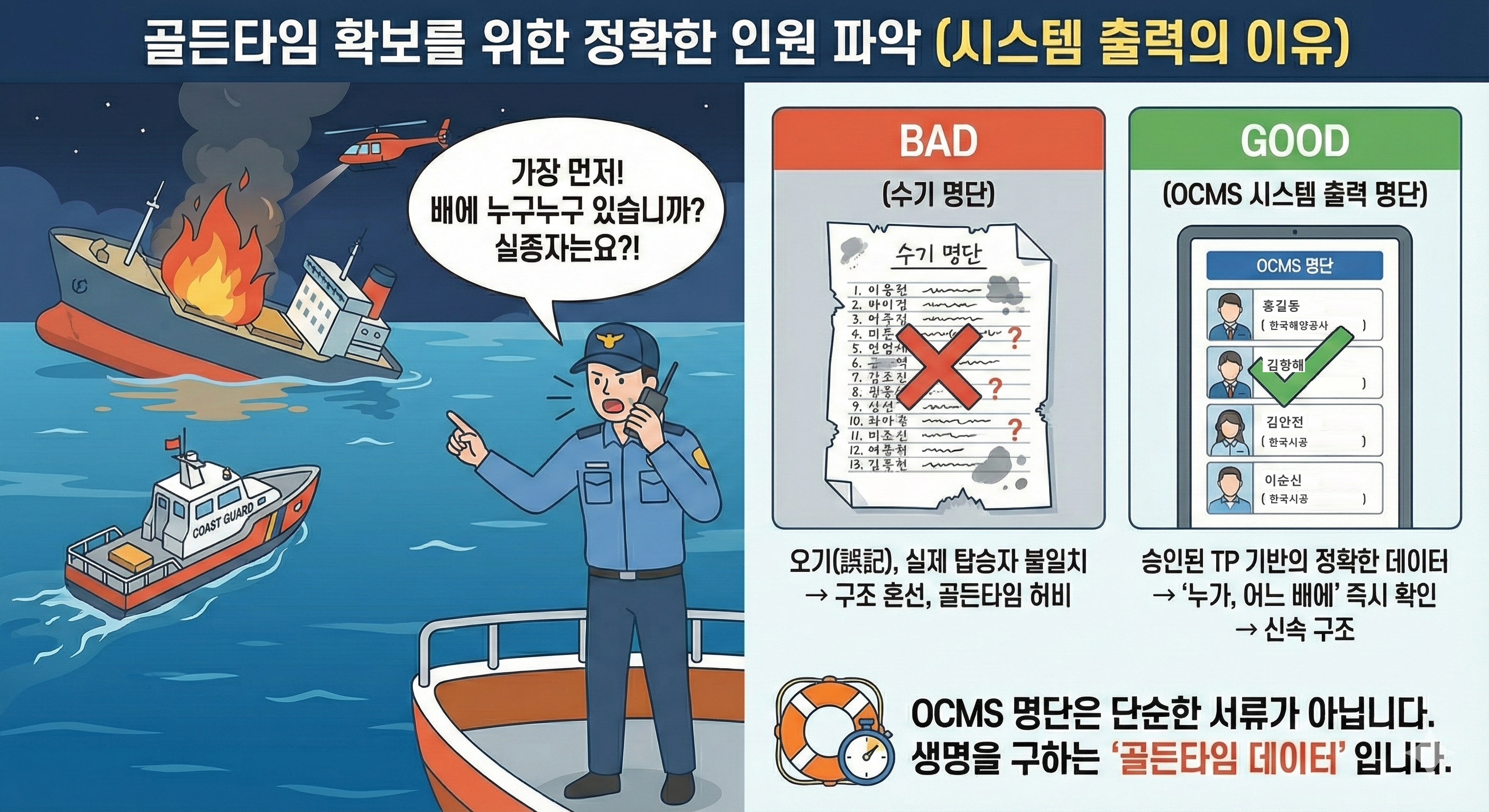 수기로 작성한 명단은 오기입이 많거나, 실제 탑승자와 다를 수 있습니다. 승인된 TP에 기반하여 OCMS에서 출력된 명단은 '누가, 어느 배를 타고, 어디에 있는지'를 가장 정확하게 증명합니다. 이것이 사고 시 구조의 골든타임을 지키는 핵심 데이터가 됩니다.